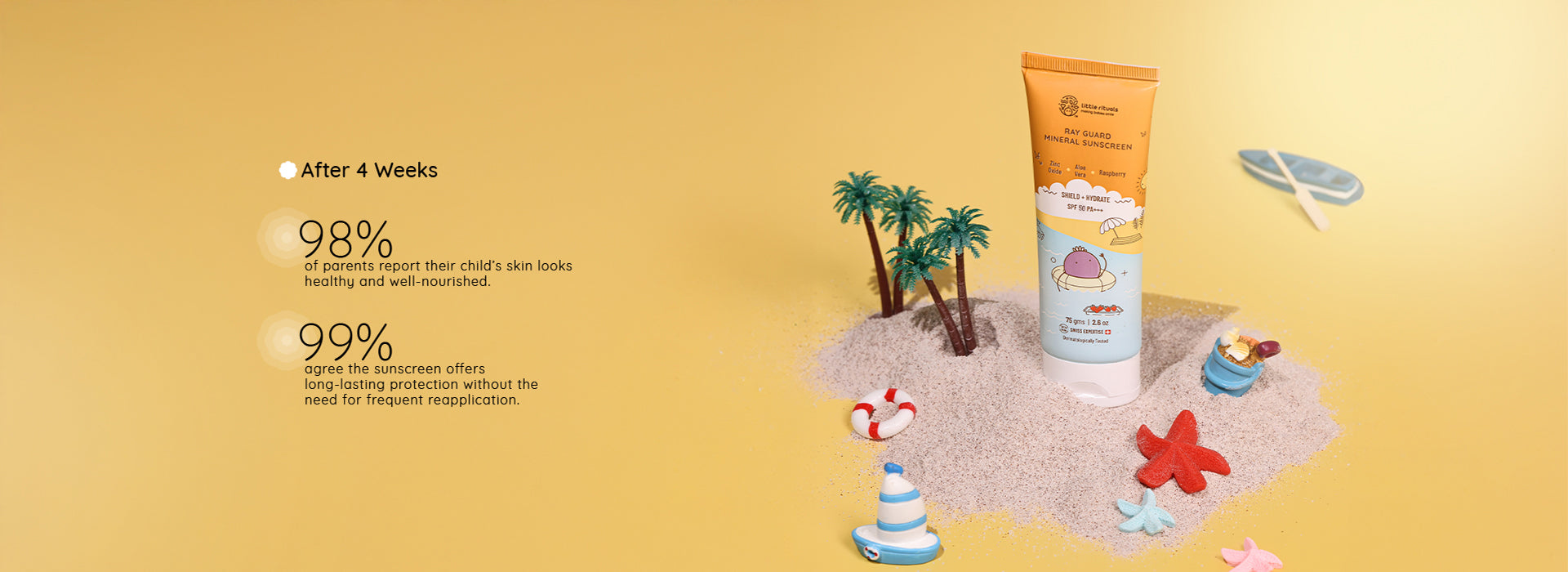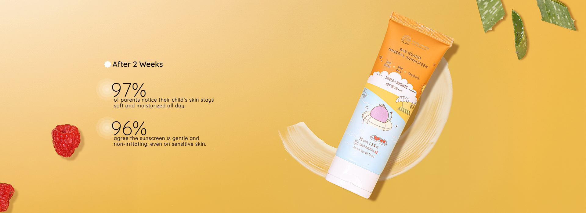 Introducing Ray Guard Mineral Sunscreen - A revolutionary sunscreen designed for babies, kids, and families, combining the purest mineral filter with powerful botanicals to protect against UVA, UVB, Blue Light & WiFi radiation. Formulated with Swiss expertise, this non-nano Zinc Oxide sunscreen offers instant, safe & irritation-free protection.