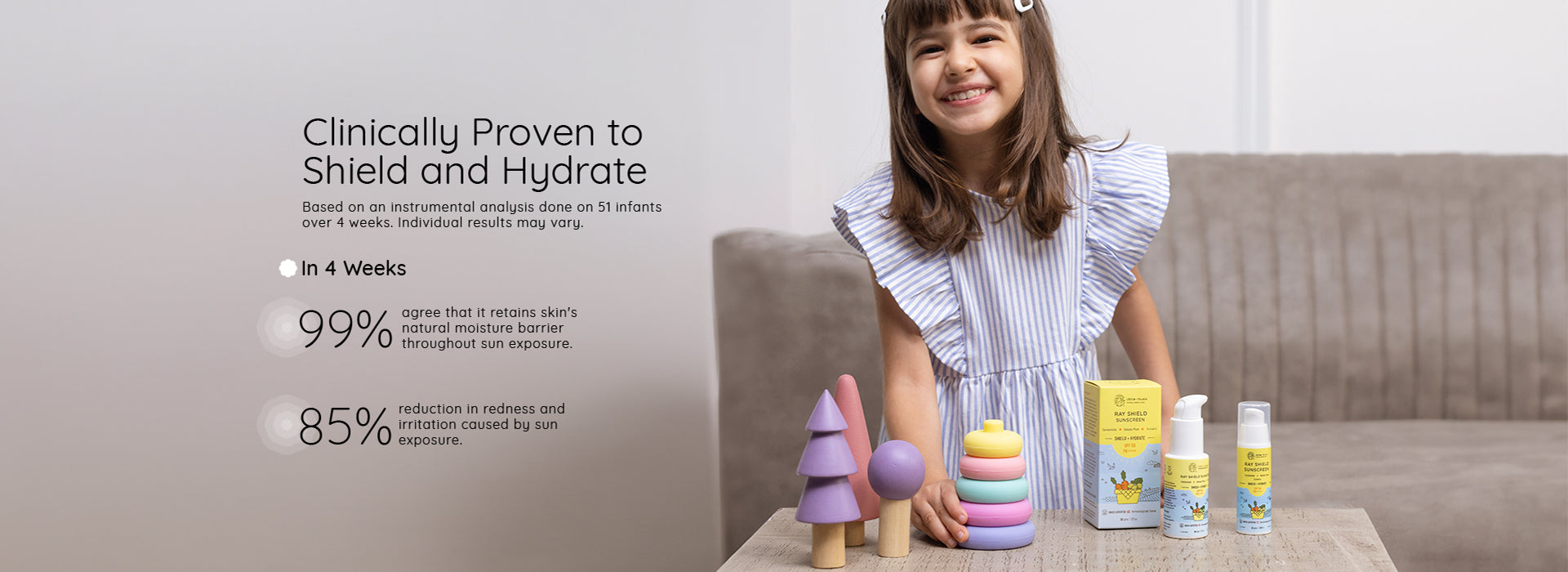 Protect your baby's delicate skin from the sun without compromise. Our Ray Shield Sunscreen offers broad-spectrum UVA/UVB protection, while also safeguarding against blue light and WiFi radiation with revolutionary RayBlock WiFi Defense SWISS technology. Clinically tested and fast-absorbing, this reef-safe formula is gentle enough for everyday use and leaves no white cast.